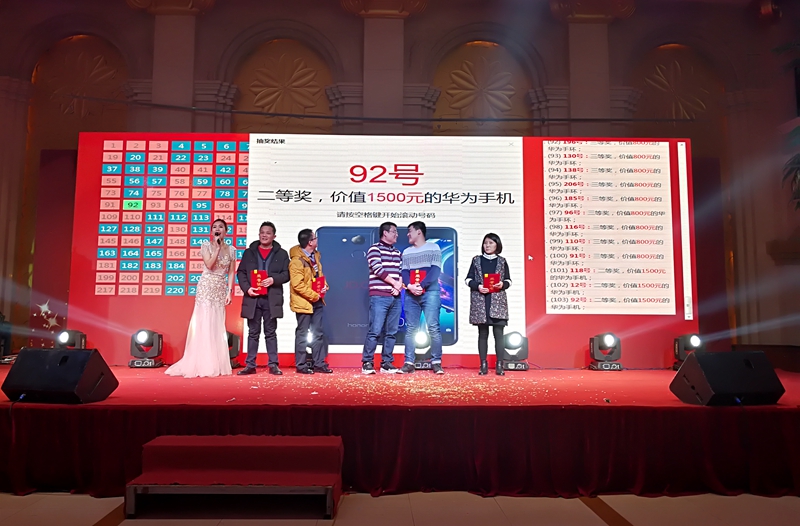在總經(jīng)理的帶領(lǐng)下,冠能公司很多同事成了“花粉”,也就是華為的粉絲。2017年年會主題,就是借用的華為公司任總的話“不破樓蘭終不還”。我們也一直弘揚類似華為的奮斗者文化,讓跟隨公司共同奮斗發(fā)展的員工,有一個獲得認(rèn)可的回報。奮斗者不一定成功,但成功者必定奮斗過,我們將繼續(xù)努力奮斗。在這幾年年會里,用于抽獎的獎品大部分都是華為產(chǎn)品。今年特等獎是5臺彩色電視機(jī),一等獎是10臺華為PAD,二等獎是20臺華為手機(jī),三等獎是40臺華為手環(huán),四等獎是60臺美的電火鍋。共計獎品135臺。在此,再次恭喜得獎的幸運朋友。